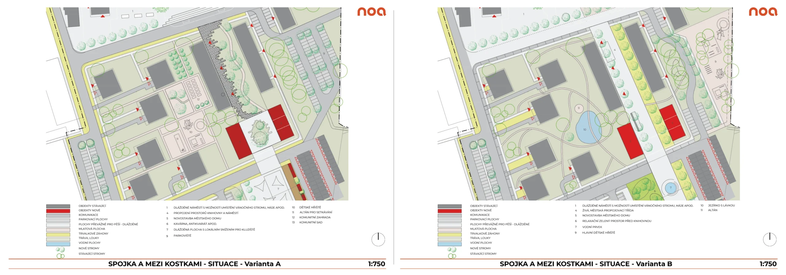 SPOJKA má v této variantě podobu bulváru – za použití různých druhů dlažby, lemovaného alejí stromů a doplněného o posezení. MEZI KOSTKAMI má prostor výrazně přírodní charakter – louka, mlatové cesty, malé jezírko, lavičky.
